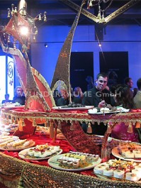 WUNDERRÄUME GmbH vermietet: Buffet-Schiff, rot-gold als Deko, Dekoration, Cateringdesign, Catering-Design, maritime Deko, Deko maritim, Dekoration maritim