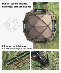 Halbkugelförmiges Kuppelzelt mit einer Zelthöhe von 1,9 m,