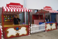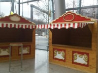 Die Markstände sind in den Farben rot-weiß bzw. auf Wunsch mit blauem Dach zu haben. Größe 2 x 1 Meter.