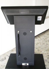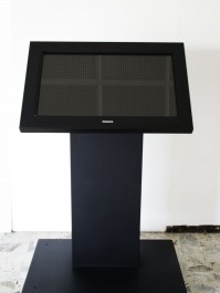 Touchterminal in schwarz mit Unterbau für Rechner oder Lautsprecher.