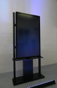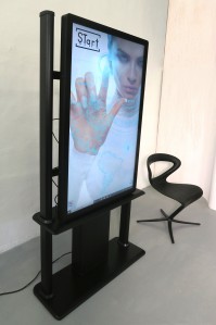 Eine Stele mit 55 Zoll Touchscreen zwischen einer Doppelsäule und mit vandalismusgeschützter Frontscheibe.