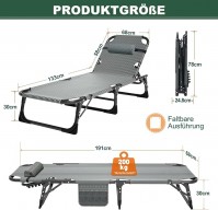 Zeltbett Sonnenliege klappbar Gartenliege 68 cm Breite 200 kg belastbar mit Matratze und Kopfstütze Klappbarer Liegestuhl geeignet für Balkon Strand Garten Als Campingbett und Gästebett 1900 x 680 x 300 mm