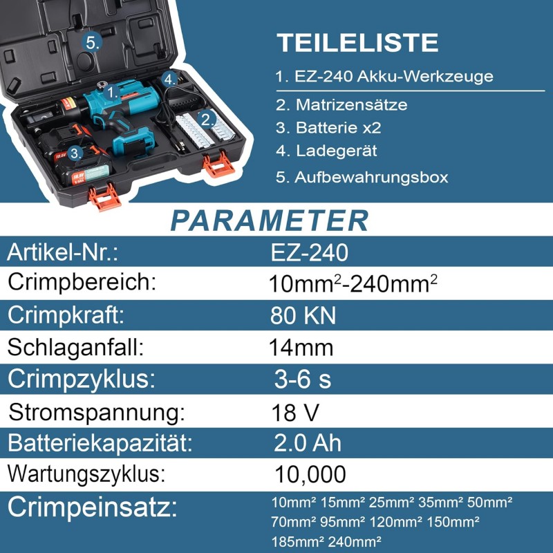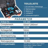 Crimpzange Kabelschuhpresse Crimpmaschine elektrisch wiederaufladbar hydraulisch tragbar 18 V Lithium 2 x Batterien 11 Sätze Crimpmatrizen 10-240 mm Akku