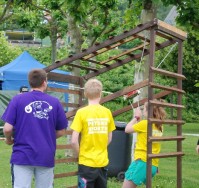 Bei den Wasserbombenschleudern handelt es sich um rechteckige Holzgestelle mit Dach – quasi kleine Häuschen – aus denen mit Hilfe von Gummizügen die Wasserbomben von den Teilnehmer in Richtung des Gegners durch die Luft geschleudert werden.