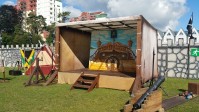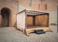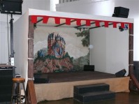 Größe 4 x 4 m Holzbühne mit Stoffbezug. Durch Austausch der Hintergrundbilder ist diese Bühne universell zum Mittelalter-, Piraten- oder Jahrhundertwendenfest einsetzbar.