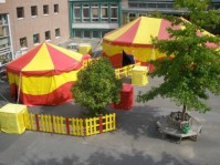 Ein kompletter Zirkus bestehend aus: Hauptzelt 8m X 12m Vorzelt: 5m Dekozäune Artisteneingang Manegenkisten Bestuhlung Beleuchteter Eingangsbogen Auf Wunsch kann auch Licht + Ton, Zirkusrequisiten oder ein Kassenhaus bereitgestellt werden. Benötigte Aufbaufläche ca 20m X 16m Außen Gelb Rot Innen Blau mit gelben Sternen Aufbauzeit: ca. 3Std. Bei Bedarf können die Zelte mit Ballasttanks anstatt Zeltankern aufgebaut werden. Somit sind auch geschlossenen Betondecken nutzbar. Für weitere Wünsche sprechen Sie uns an.