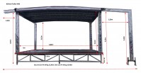 Der Zugang erfolgt über eine Treppe mit Handlauf aus Leichtmetall, die wahlweise an der Bühnenfront oder an vier verschiedenen Positionen seitlich und hinten angebracht wird. Das Bühnendach ist eine Aluminium-Konstruktion mit integrierten Traversen (Befestigungsmöglichkeiten für Scheinwerfer). Die Dachhaut besteht aus einer widerstandsfähigen, PVC-Plane, diese ist Schwarz, Seitenwände sind ebenfalls in schwarz.