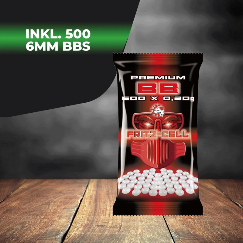 und einen Beutel Fritz-Cell Premium BBs mit 500 Schuss.