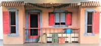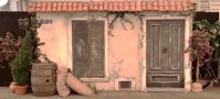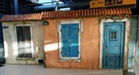 Diverse bunte handgemalte Hausfassaden mit Fahnen und Schildern.