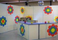70er Jahre Prilblumen Lounge Kulisse mieten, Loungetapete, Longekulisse, Kulisse, Blumenkulisse, Blümchen, Party, Messe, Event, Veranstaltung