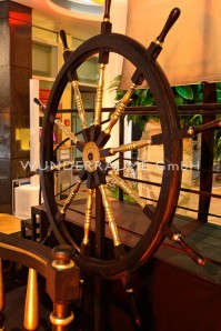 • maritime vollplastische Dekoration mit XXL-Steuerrad und Segel