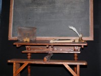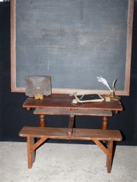 Schiefertafel, Schulbänke, Griffel, Schultaschen, Kostüme um eine Klasse aus dem 1900 Jahrhundert darzustellen.