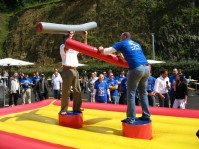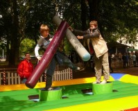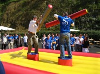 Wie im alten Rom treten hier die “Gladiatoren” gegeneinander an. Zwei Mitspieler versuchen sich mittels eines Schaumstoffstabs gegenseitig vom Sockel stoßen. Hier ist Ihr Gleichgewichtsinn und Ihre Ausdauer gefragt. Die luftgefüllte Umrandung sorgt bei diesem unfreiwilligen Abstieg für eine weiche Landung. Unser geschulter Mitarbeiter betreut das Spiel und fungiert gleichzeitig als Schiedsrichter. Optional hierzu können Sie auch einen Spielemoderator dazu buchen sowie eine Soundanlage für eine professionelle Moderation.