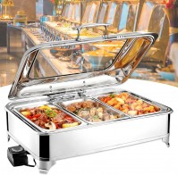 Elektrischer Speisewärmer 1/3 Chafing Dish Glasdeckel 9L Wärmebehälter Buffet Edelstahl Buffetwärmer 3 x 3 L einstellbare Temperatur für Hotels Buffet Party