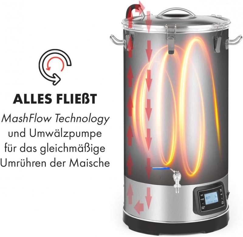 Die ebenfalls vorhandene Umwälzpumpe erleichtert das Rühren der Maische.
