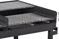 Merkmale: feststellbare Laufrollen, höhenverstellbare Grillroste, Windschutz