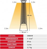 Der Infrarot Standheizstrahler hat eine Leistung von 2000 W und erzeugt somit