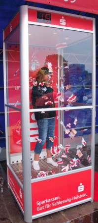 In unserem neuen Aktionsgerät Cashtwister können Spielscheine in Form von Losen, Gutscheinen, Geldscheinen usw. verwirbelt werden. Der Spieler steigt in den Cashtwister ein und versucht möglichst viele Spielscheine zu fangen. Ein Riesenspaß für Spieler und Zuschauer.