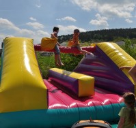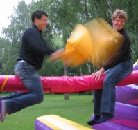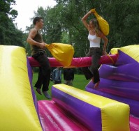 Beide Teilnehmer erhalten ein Kissen und müssen versuchen einander aus dem Gleichgewicht zu bringen und von dem Balken zu schubsen.