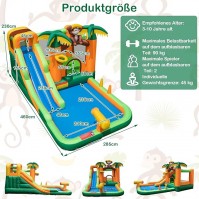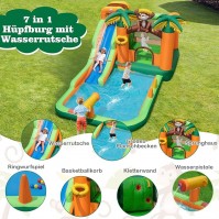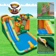 Wasserpark Hüpfburg mit Wasserrutsche tropischer 7-in-1 Wasserpark mit langer Rutsche Planschbecken Basketballkorb & Wasserpistole inkl. Gebläse 460 x 285 x