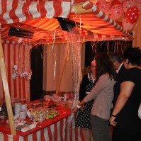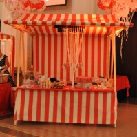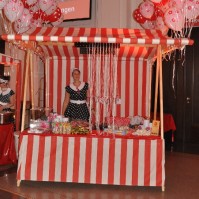 Klassisches Fadenziehen an einem schönen rot-weißen Marktstand .