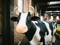 Wir vermieten keine billigen aufblasbaren Kühe sondern große Kunststoff Kuh Atrappen.