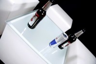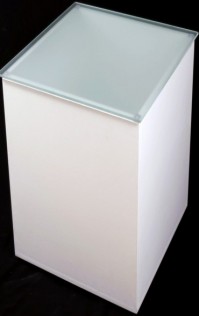 Die Abstellfläche besteht aus einer satinierten Acryl-Glasplatte. Bei eingeschalteter Beleuchtung erstrahlen die Oberfläche und die abgestellten Gegenstände in Weiß.