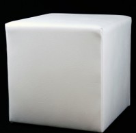 Die Würfel haben eine gepolsterte Sitzfläche von 45 cm x 45 cm bei einer Sitzhöhe von ebenfalls 45 cm. Der Bezug ist weiß und aus abwaschbarem Kunstleder.