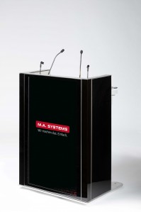 Standardmäßig ist das Pult in hochglanz weiß und schwarz verfügbar, optional können Sie das Pult individuell branden lassen oder z.B. auch im Bambus-Look mit einem Stoff bespannen.