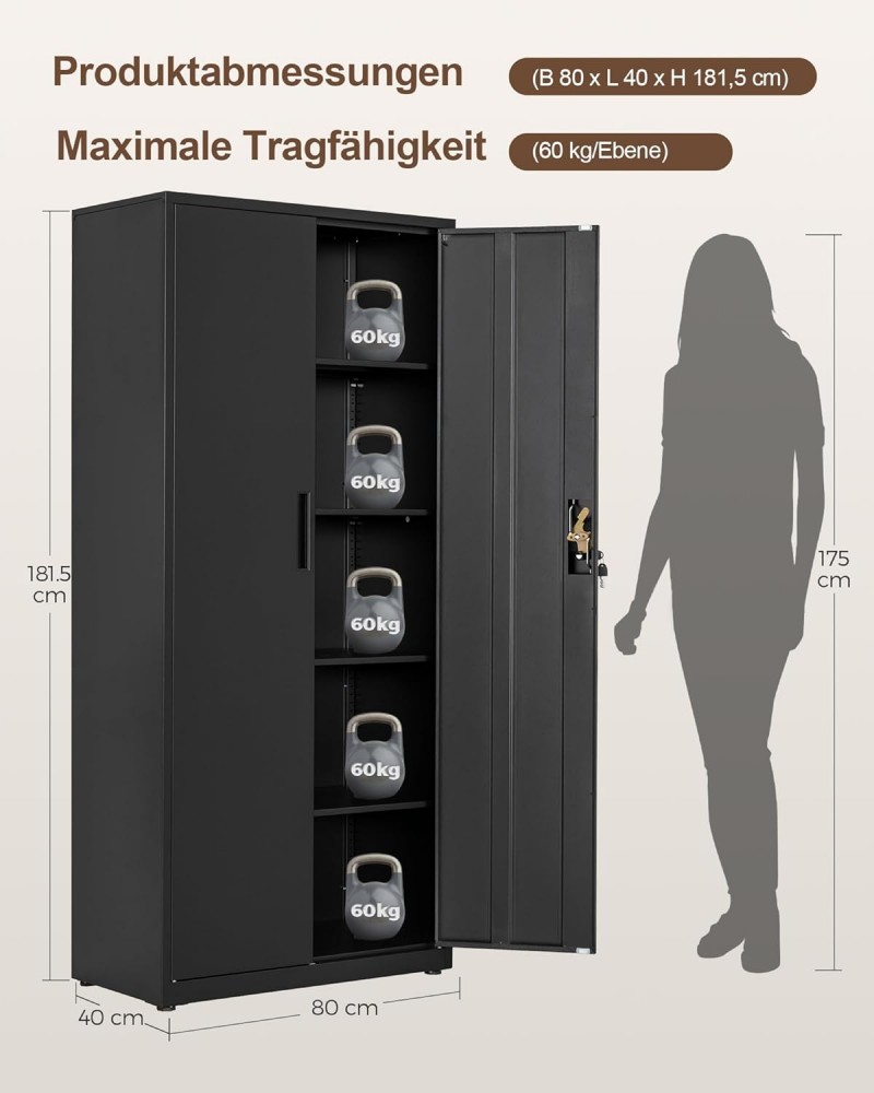 Aufbewahrungsschrank besteht aus robustem Stahl, jede Ebene trägt bis zu 60 kg.