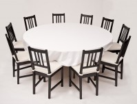 Set Vintage 1x Tisch rund 180cm inkl. Tuch weiß, 10x Holzstuhl Vintage mit Sitzkissen