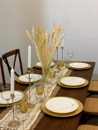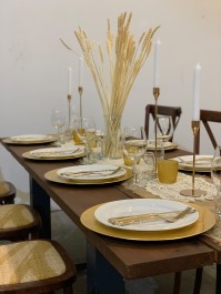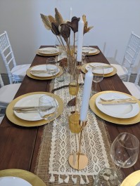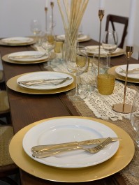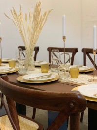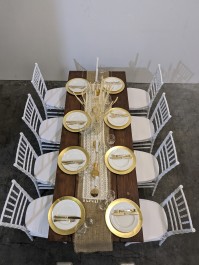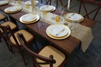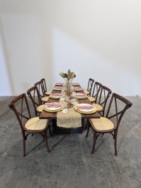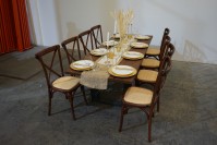 Der Tisch passt perfekt zu unseren Crossback-Stühlen aus Holz. Diese können Sie ebenfalls bei uns mieten.