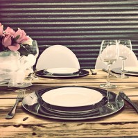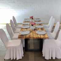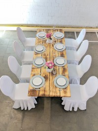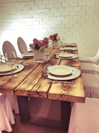 rustikaler Banketttisch aus alten Holzbohlen. Perfekt für Vintage-Hochzeiten. Ohne Tischdecke einsetzbar.