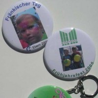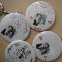 Die stabilen Metall-Buttons haben einen Durchmesser von 55 mm und sind gegen Aufpreis auch als Anstecker, Clips, Schlüsselanhänger bzw. Anhänger erhältlich.