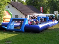 Endlich einmal Fußball spielen, ohne je ein Training absolviert zu haben: Auf diesem 14 m x 7, 5 m großen Spielfeld können bis zu zehn Spielerinnen und Spieler gegeneinander antreten. Eine riesige Gaudi für jedes Firmen- oder Vereinsfest – mit garantiertem Spaßfaktor!