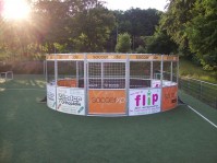Runder Fußballkäfig. Vermarktung (Branding, Werbung) des Soccer Cages individuell möglich.