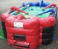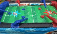 Das ganze ist aufblasbar und der Ball wird mit Luftschläuchen in Tor geschossen.
