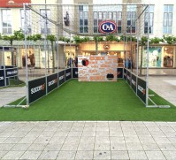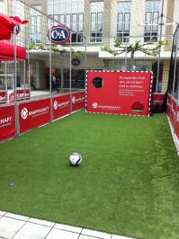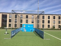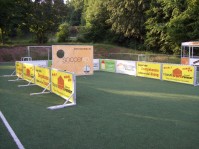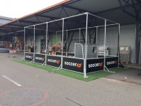 Stabile Torwand aus Aluminium. Vermarktung (Branding, Werbung) sowohl auf der Torwand, als auch auf der Rundumbande (Käfig), individuell möglich.