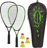 Badminton Set Profi 2 handliche Aluminiumschläger Länge 54,5 cm 3 windabweisende Bälle perfekt für einen windabweisenden und schnellen Federball hochwertige Tasche grün/schwarz