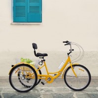 Dreirad Lastenrad Seniorenrad Erwachsenendreirad Faltbike Campingbike 24 Zoll für Erwachsene faltbares Dreirad 7-Gang-Dreirad mit LED-Licht + Einkaufskorb gelb
